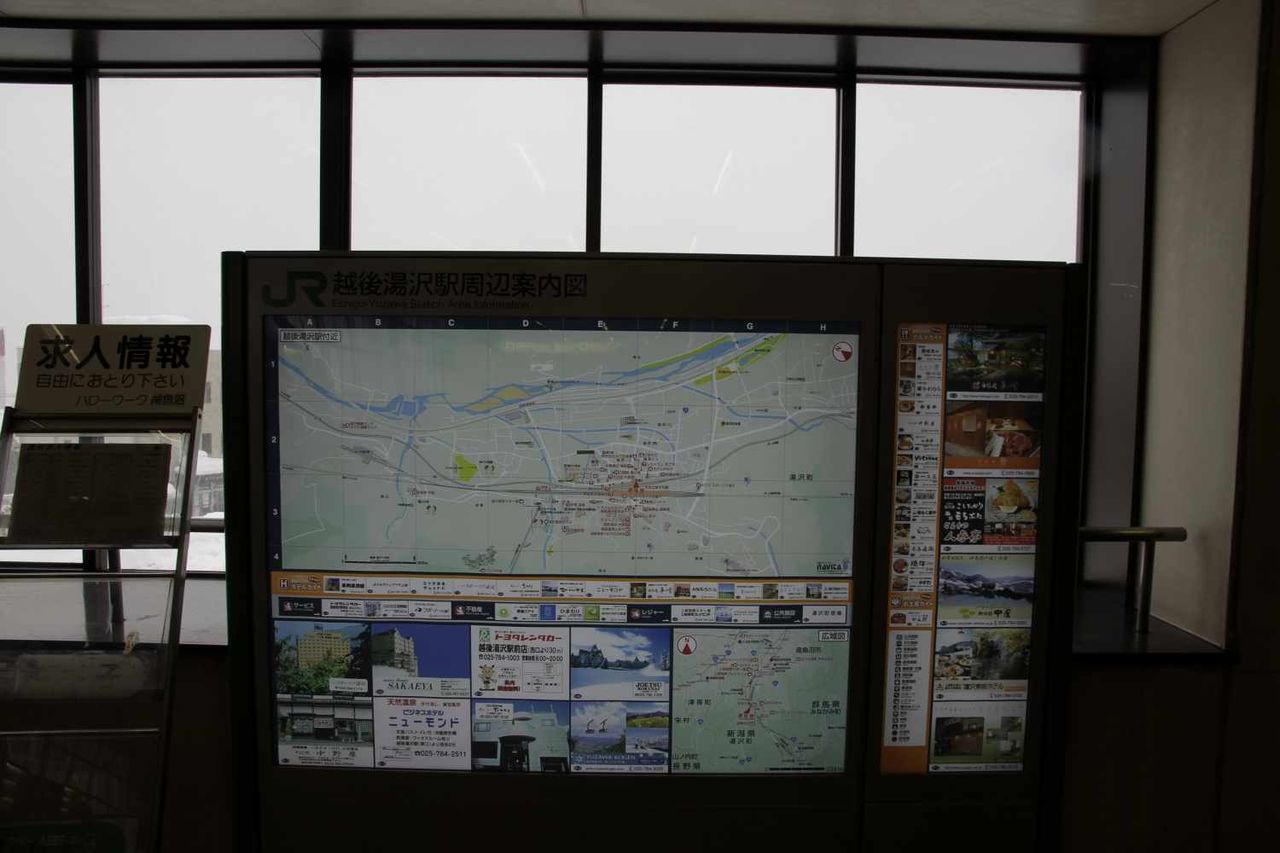 駅東口出口前には越後湯沢駅周辺の地図があり、その地図を見ると