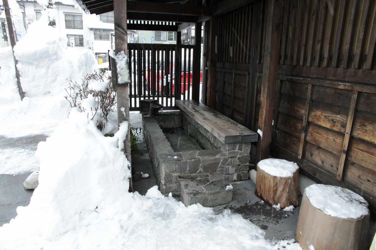 お湯が流れる所にはつららが立ち、足湯槽にも勿論お湯は張られていませんでした。