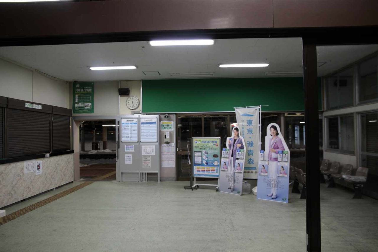 奥の壁には只見線の時刻表と、只見線内で車内販売が行われない事の