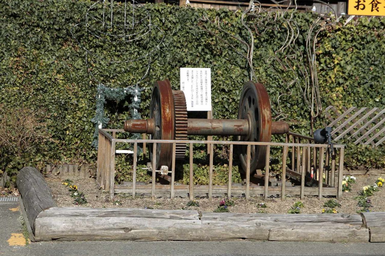 駅前に戻った後は、駅付近の花壇の中に展示されたアプト式車両に使われた車輪の見学や
