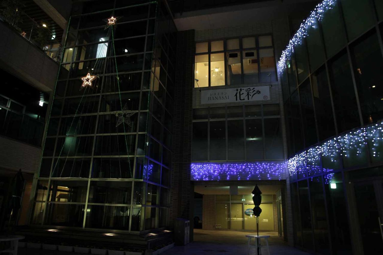 建物の壁にイルミネーションが施されたショッピングモールのような場所があり