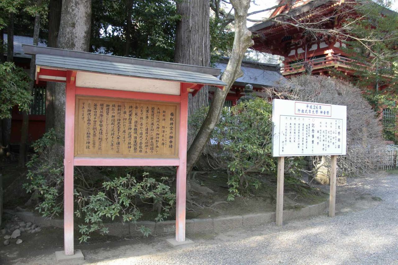 楼門の手前には香取神宮の御由緒と書かれた看板があり、御祭神が経津主大神である事や