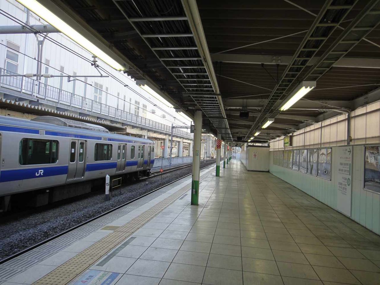 JR側ホームへと入ると、電気供給を切られたE531車両がホーム上に停車していました。