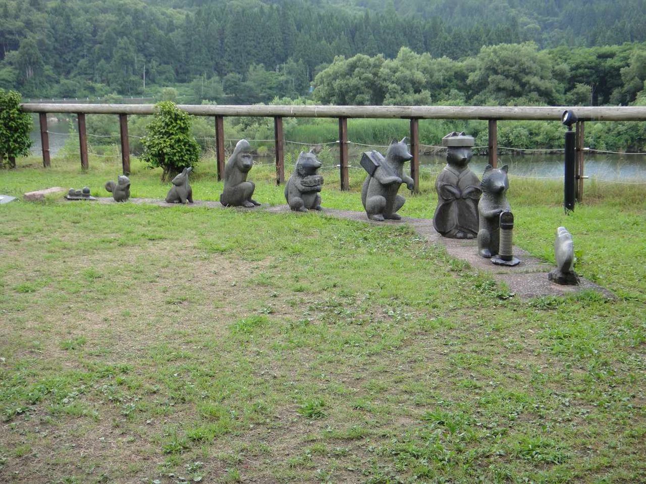 津川駅の近くのキツネの嫁入り屋敷の敷地内には、キツネの嫁入りを模した石像が展示され