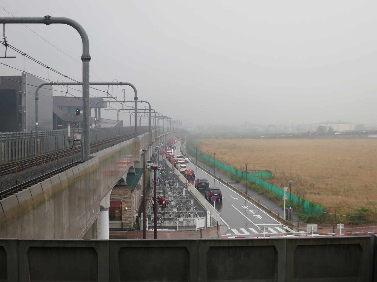 イオンレイクタウンの駐車場へと続く道路の状況をホーム上から見ると