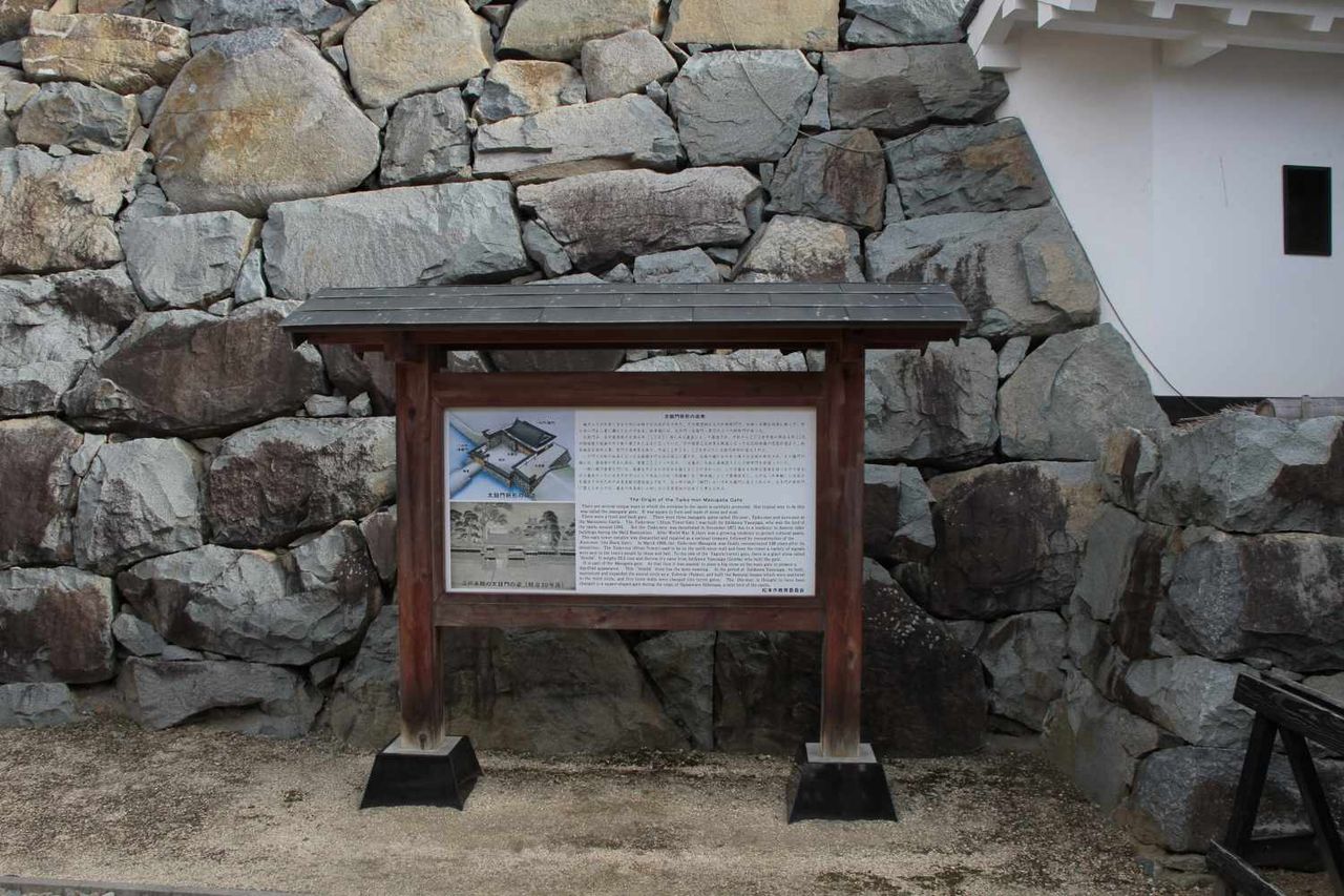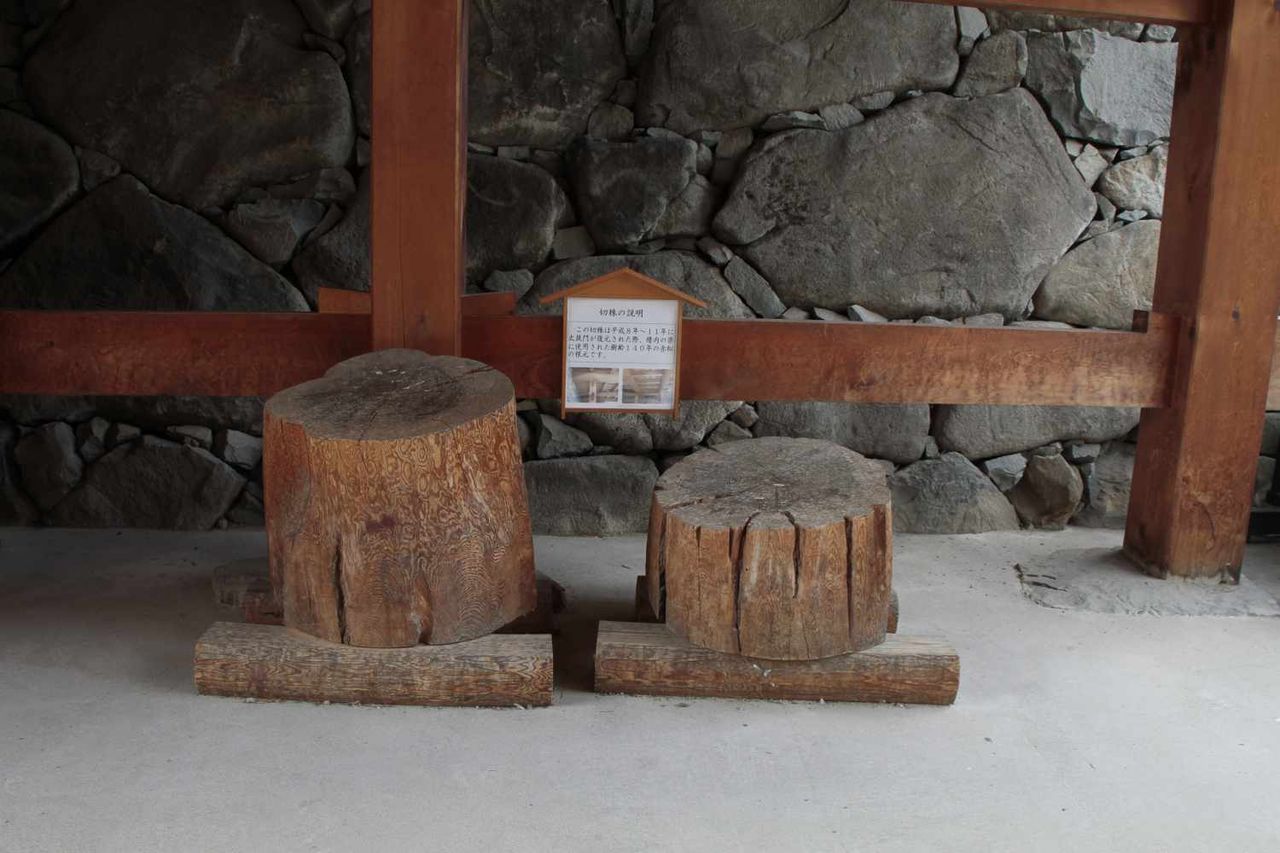 ※門の近くには門に使われたと思われる切り株の説明をした資料が展示されています。
