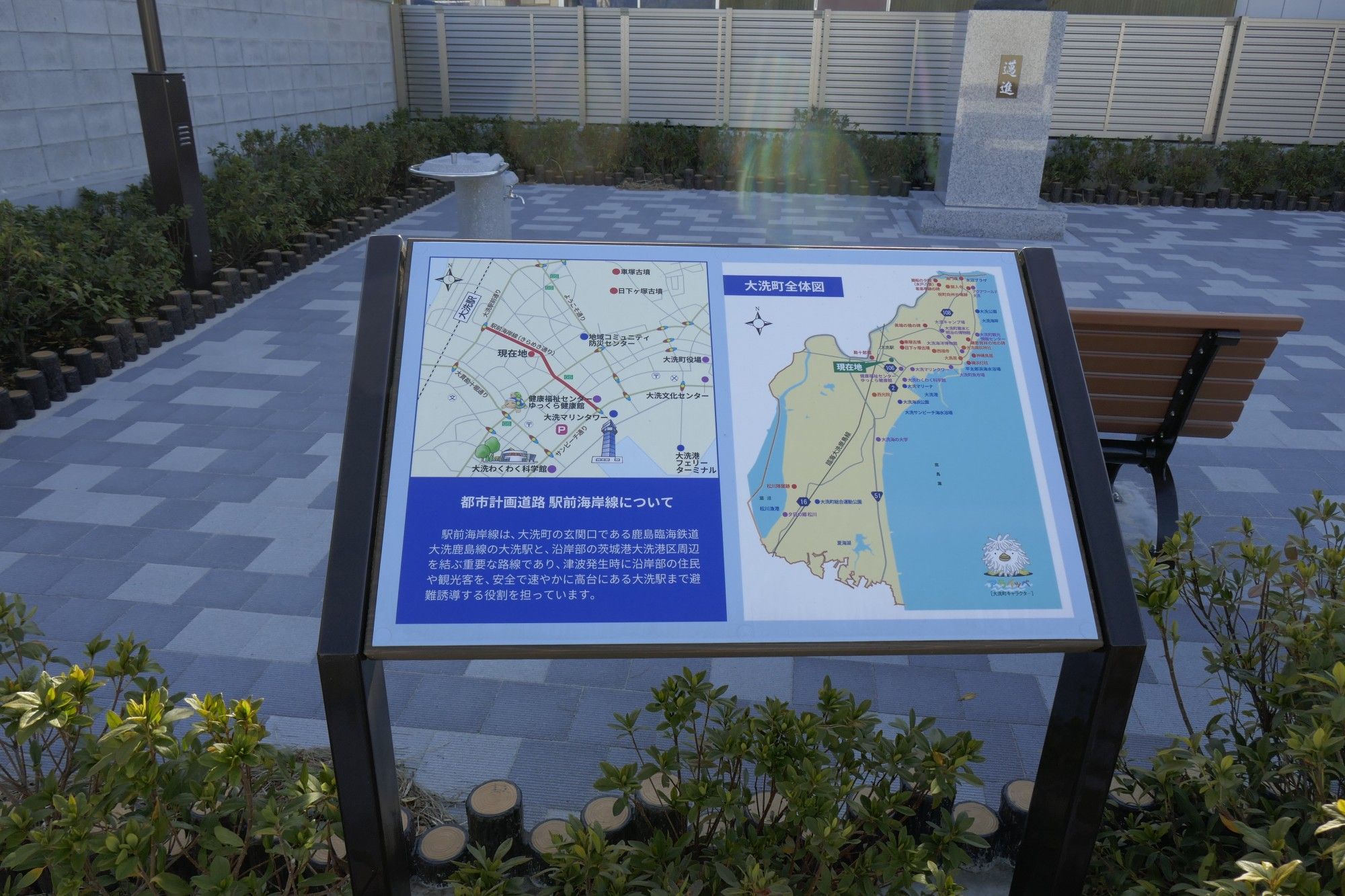 フリースペース前の看板には、このきらめき通りは、津波発生時に沿岸部の住民や観光客と高台の上にある大洗駅方面へ避難するために作られた道とのこと。