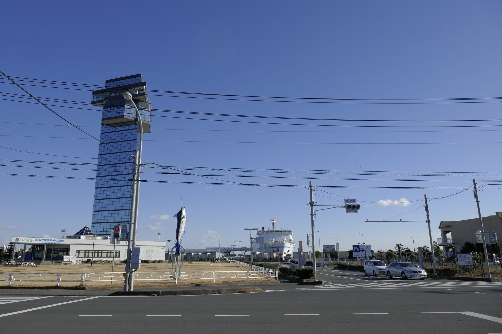 交差点に到着。左手には大洗町のランドマークタワー、大洗マリンタワーがあります。