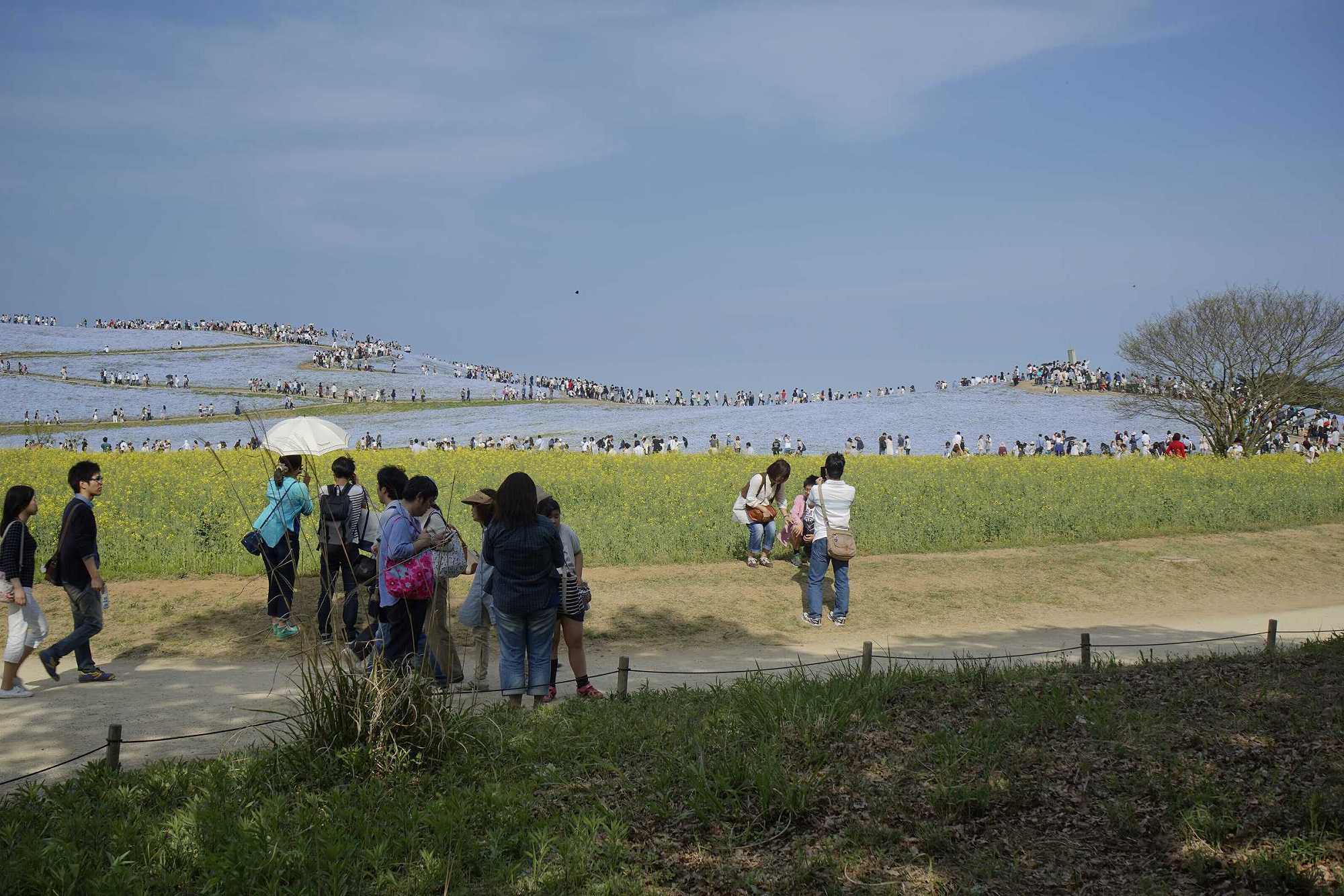 遠目でネモフィラの咲き乱れる丘を見ると、空の上を人が歩いているような光景が見え